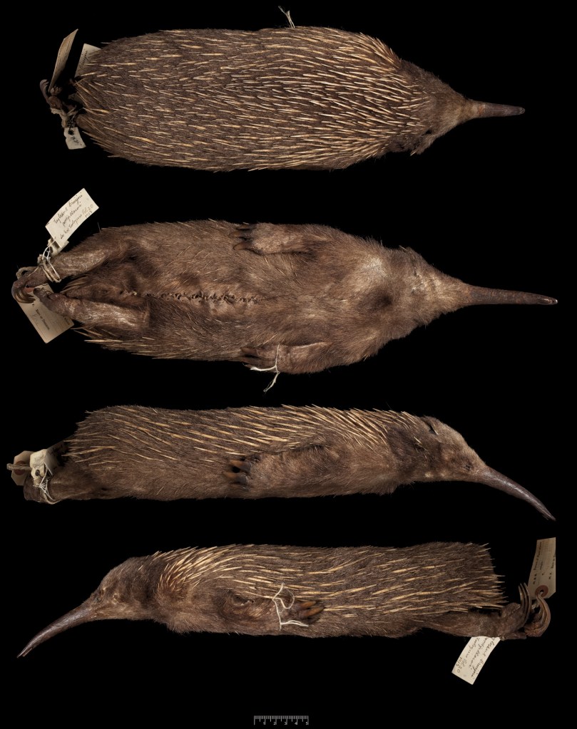 Tunney had caught the echidna on 20th November 1901. He prepared a taxidermy specimen consisting of the skin, most of the skull and the right forearm, giving it the fieldmark 347 and sending it off to the UK. We know he did this because of the date given on his specimen’s tags and because of import paperwork1. But Tunney left the ‘Species’ field blank on his tag, presumably because he wasn’t sure quite what he’d found. On receipt in England, the specimen was noted by Oldfield Thomas who removed and observed the skull and forearm for identification. He concluded it to be an immature Zaglossus echidna, not part of Tachyglossus which contains the short-beaked echidna widely known from Australia, and noted similarity to the western long-beaked Zaglossus bruijnii. From there, the specimen passed to the Rothschild collection1. It went unpublished in the literature, perhaps because Thomas was waiting for Rothschild to make a publication and was hoping for an adult specimen to help in his own study1. The only papers relating to the skin describe a flea and a mite, each found in the dead animal’s fur, and call the specimen a Tachyglossus (short-beaked echidna), likely an assumption based on its location1. Thus, Tunney’s animal passed into obscurity almost immediately.