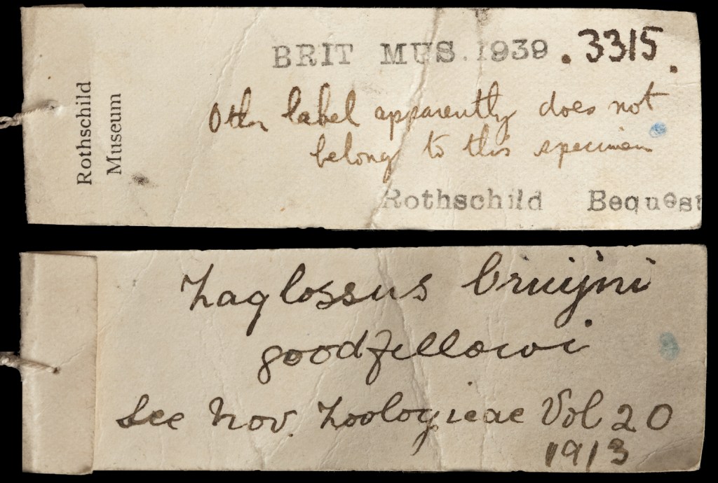 The specimen went seemingly untouched until 1913 when Fred Young, one of Rothschild’s resident taxidermists at Tring, re-examined the echidna and gave it a new label. This simply stated the existing label was wrong, mismatched. No specific argument was given but, with a touch of snark and irony, Young left a citation for one of Rothschild’s own publications: a summary of the echidnas held in the collection, with a key to their identification. Tunney’s Specimen 347 was not included in this record and the key gave Zaglossus bruijnii’s home range as the island of Salawati, at the time the only place it was known to inhabit. Presented with a specimen which shouldn’t be in the collection and which apparently came from the wrong place, Young wrote it off as a label mismatch. The skin was stuck in a drawer and forgotten about for a hundred years, only seeing some activity when it was unceremoniously renamed BMNH 1939.3314 and moved to the British Museum of Natural History with much of the rest of the Rothschild collection, where it continued its torpor.